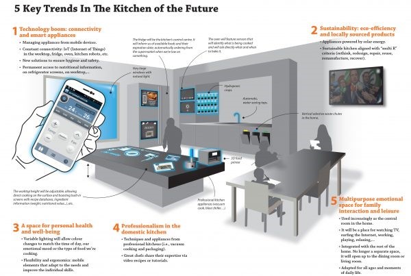 Among the items the report predicts will be in the kitchens of the future are hydroponic crops to provide food with the shortest possible distance from ‘farm’ to plate; 3D food printers that would allow users to download and ‘print’ recipes; adjustable-height worktops embedded with digital surfaces and smart fridges complete with the ever-predicted smart screens.